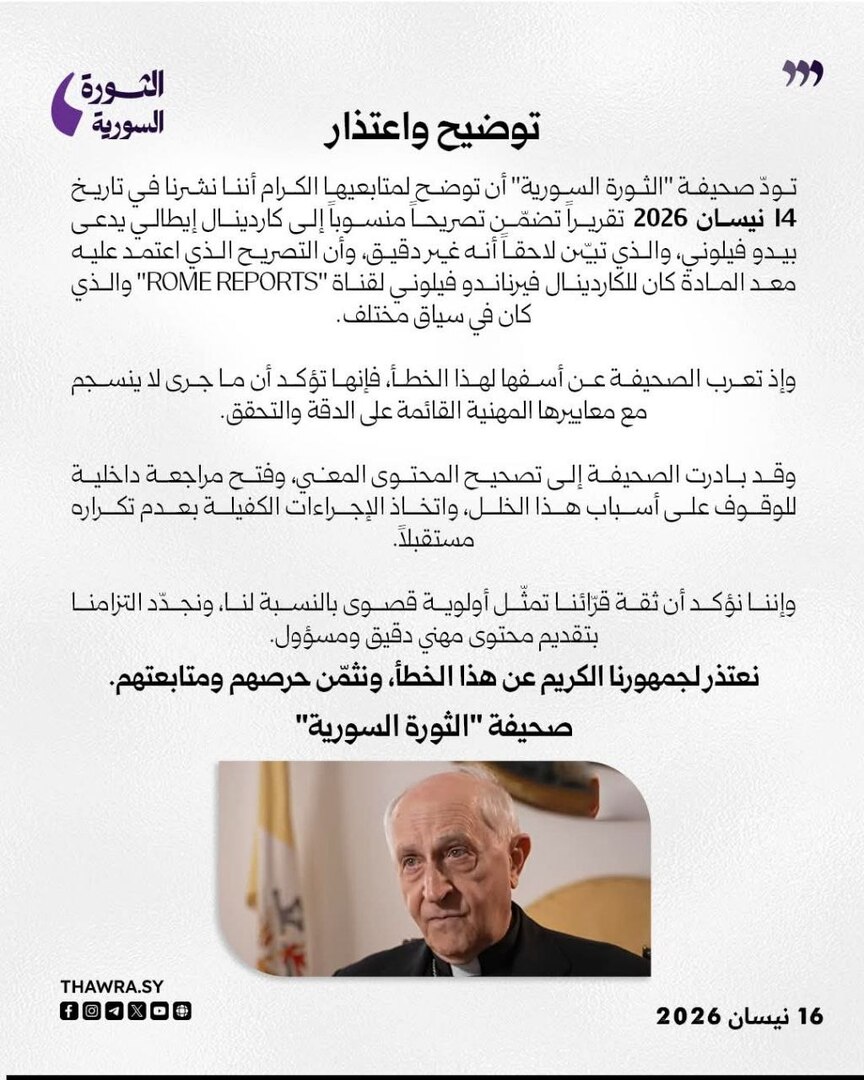 اعتذرت صحيفة "الثورة السورية" عن نشر تصريح غير دقيق منسوب لكاردينال إيطالي، تناول "مناخ التعايش بين الأديان الذي يقدمه الرئيس السوري أحمد الشرع".