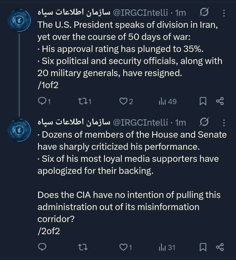 وجاء في منشور لاستخبارات الحرس الثوري على منصة "إكس": "يتحدث رئيس الإدارة الأمريكية عن الانقسام في إيران، في حين أنه خلال 50 يوما من الحرب: