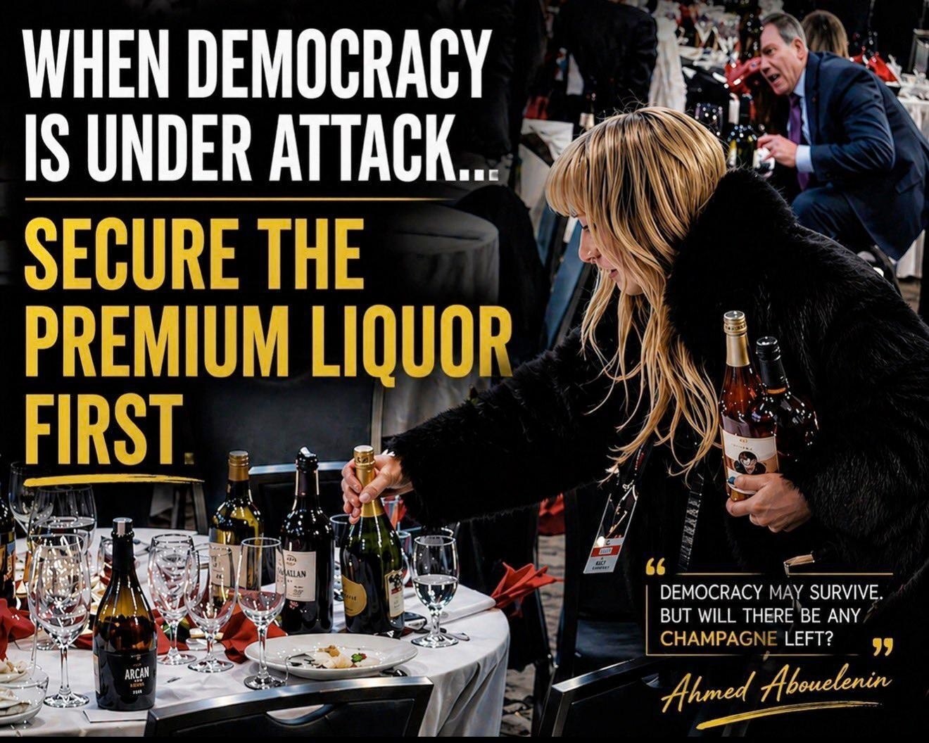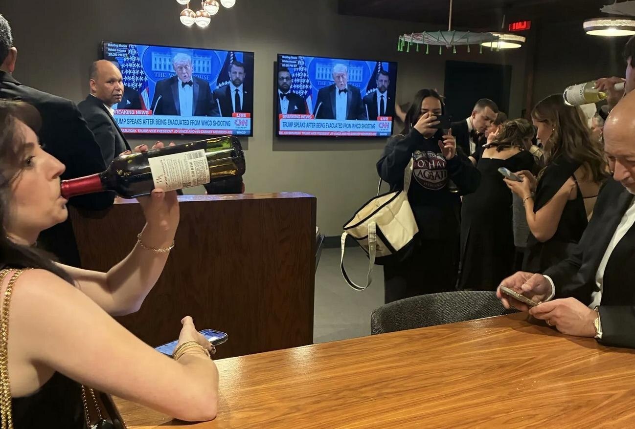 وبحسب الفيديوهات المتداولة، يظهر صحفيون وهم يحتسون الخمر بهدوء، بينما خلفهم يجري عناصر الأمن عملية إخلاء السياسيين وتأمين المنطقة وملاحقة مطلق النار. وبدا الصحفيون غير مبالين بما يحدث، بعضهم منشغل بسرقة زجاجات النبيذ.